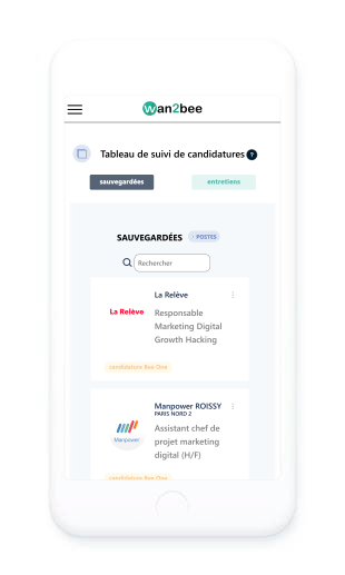 Un tableau de suivi enregistre toutes les offres auxquelles Wan2bee postule pour que tu puisses gérer l'évolution de chaque candidature.